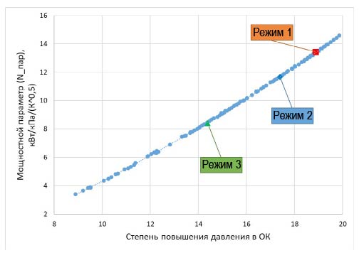 Представленные в табл. 1 значения мощностного параметра и степени повышения давления в ОК для режимов 1–3 нанесены на график (рис. 6). На этот же график нанесены все точки (зависимости мощностного параметра от степени повышения давления в ОК), полученные на математической модели ГТУ в широком диапазоне температур наружного воздуха и режимов работы, с учетом поправки на частоту вращения ТНД.