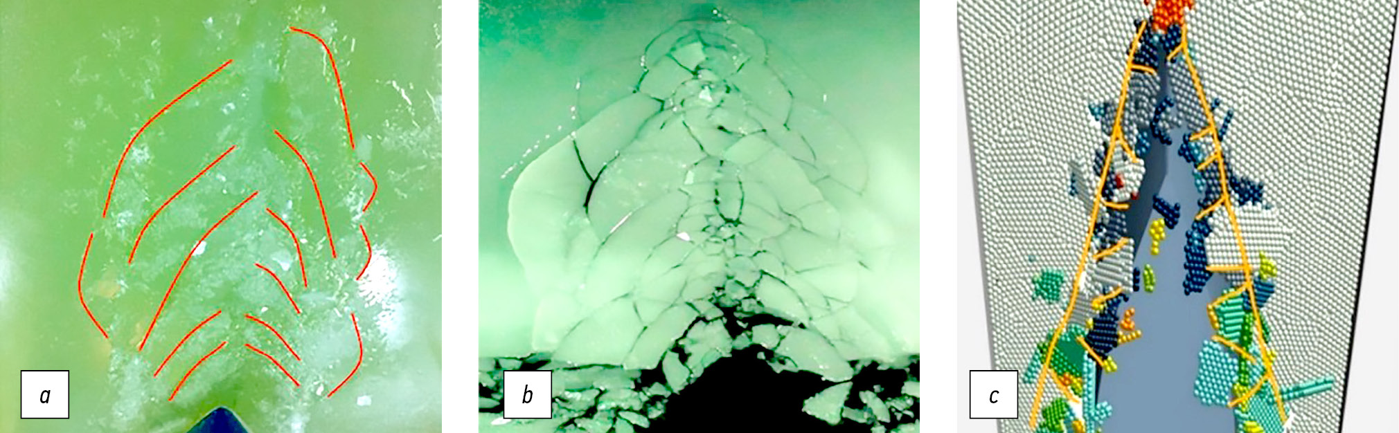 В численном моделировании большой проблемой является создание хрупкого сплошного льда на свободной поверхности (рис. 3). В [24] авторы частично решают эту проблему с использованием одностороннего сопряжения метода вычислительной гидродинамики и дискретных элементов. Наблюдается процесс распространения радиальных и кольцевых ледяных трещин.