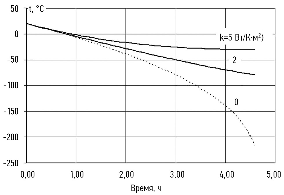 Видно, что весь запас водорода будет израсходован за время, несколько превышающее 1 час. При этом температура водорода будет превышать 0 °С только при достаточно интенсивном тепловом взаимодействии с окружающей средой (k = 20 Вт/(К ∙ м2)), что может оказаться труднореализуемым затесненном отсеке для баллона. Если же баллон будет покрыт оболочкой из малотеплопроводного материала, температура в нем может опуститься до неприемлемо низких значений. Пунктирная линия соответствует предельному случаю идеальной тепловой изоляции блока хранения.
