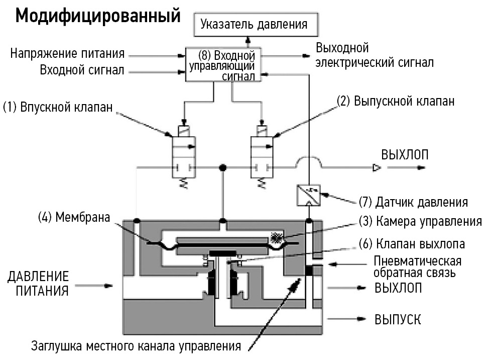 Движение мембраны 4 вниз, а также возрастание выходного давления будут происходить до момента, когда мембрана 4 придет в равновесное состояние из-за воздействия давлений на неё с двух сторон. При этом сигнал рассогласования в блоке управления 8, получаемый из разницы между входным управляющим сигналом и сигналом обратной связи от датчика 7 не станет равным нулю.