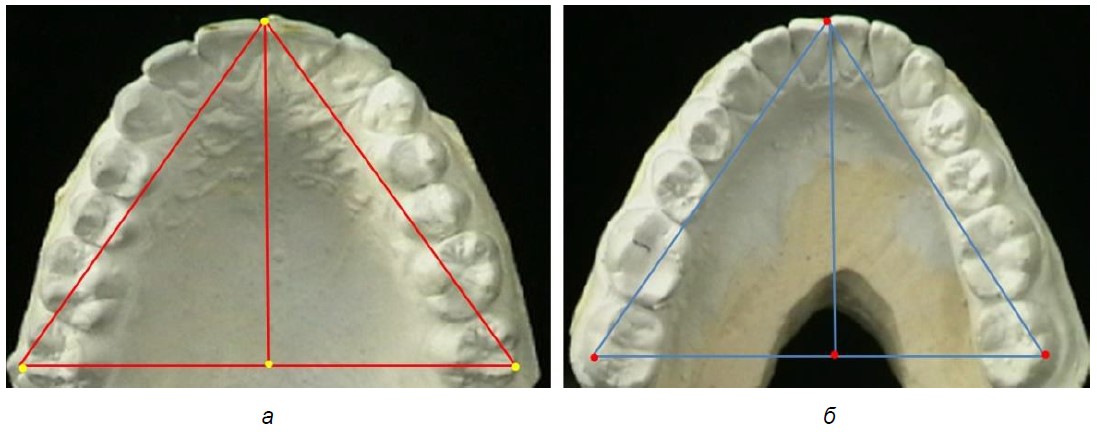 Рис. 1. Модели верхней (а) и нижней (б) челюсти с контурами треугольника