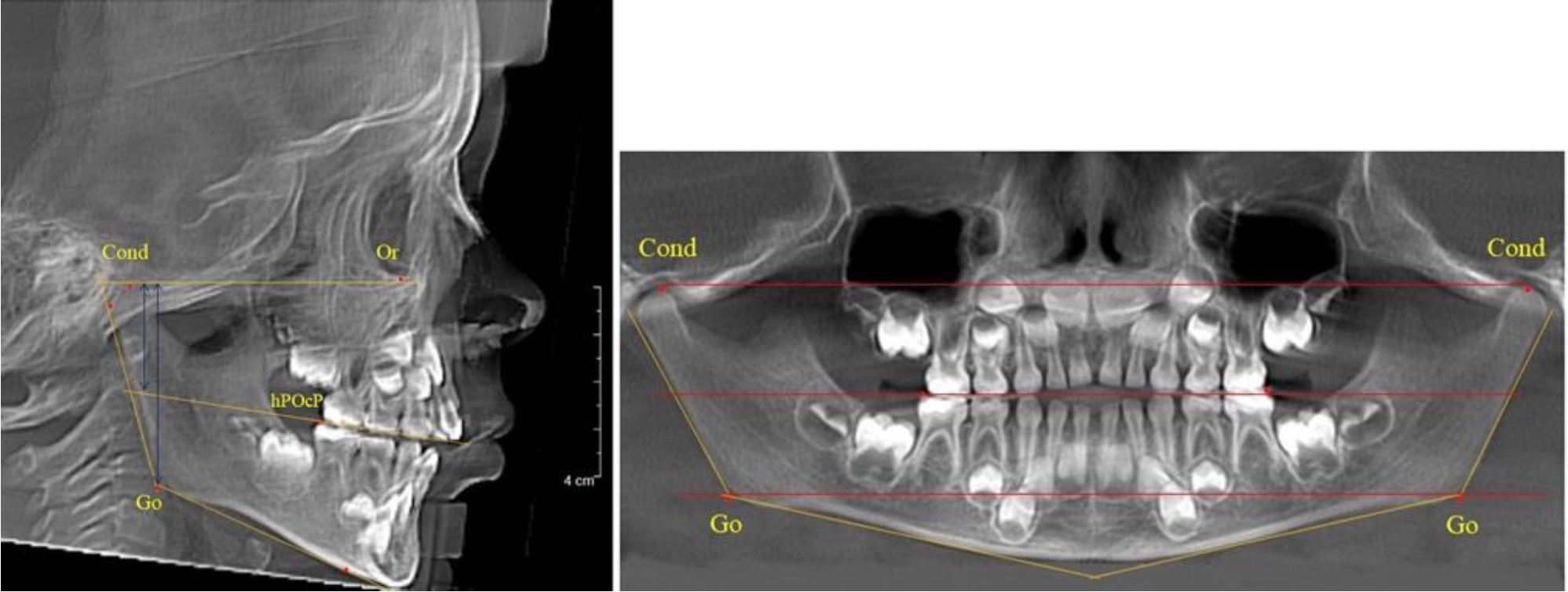 На боковых телерентгенгенограммах вершину суставной головки обозначали точкой кондиион Cond. Касательные линии к ветви и телу нижней челюсти пересекались в точке, которую обозначили Go. Точкой hPOcP обозначали дистальный бугорок нижнего второго моляра вблизи окклюзионного контура коронки. Указанный ориентир соединяли с межрезцовой точкой при построении окклюзионной линии. Высота ветви определялась расстоянием Go-Cond. Окклюзионная линия служила границей между верхней (окклюзионно-суставной) линией и нижней (окклюзионно-альвеолярной) линией.