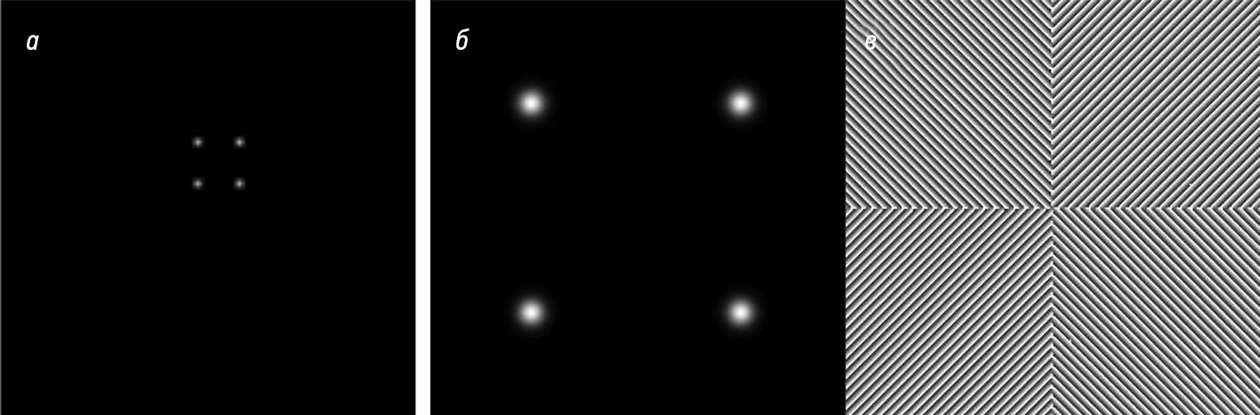 Рис. 1. а — изображение, загруженное в программу; б — полученное распределение интенсивности; в — полученное фазовое распределение