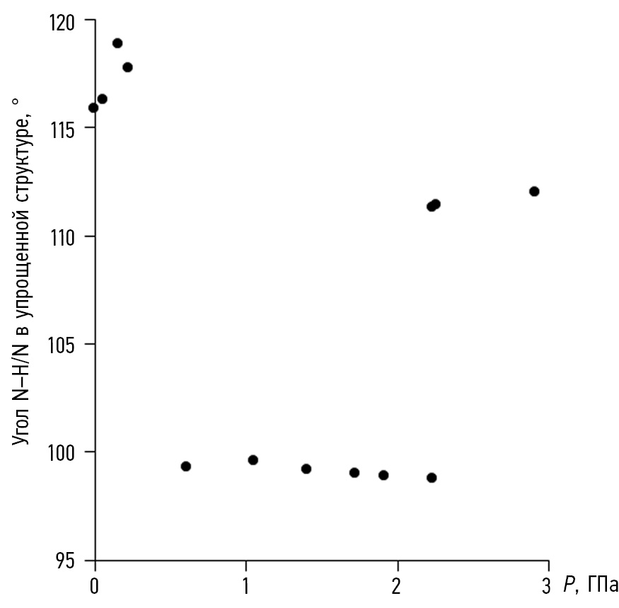 Также была выявлена зависимость изменения угла N···H–N в упрощенных структурах бензимидазола, которая наглядно иллюстрирует характер изменения упаковки молекул от величины внешнего давления (рис. 3).
