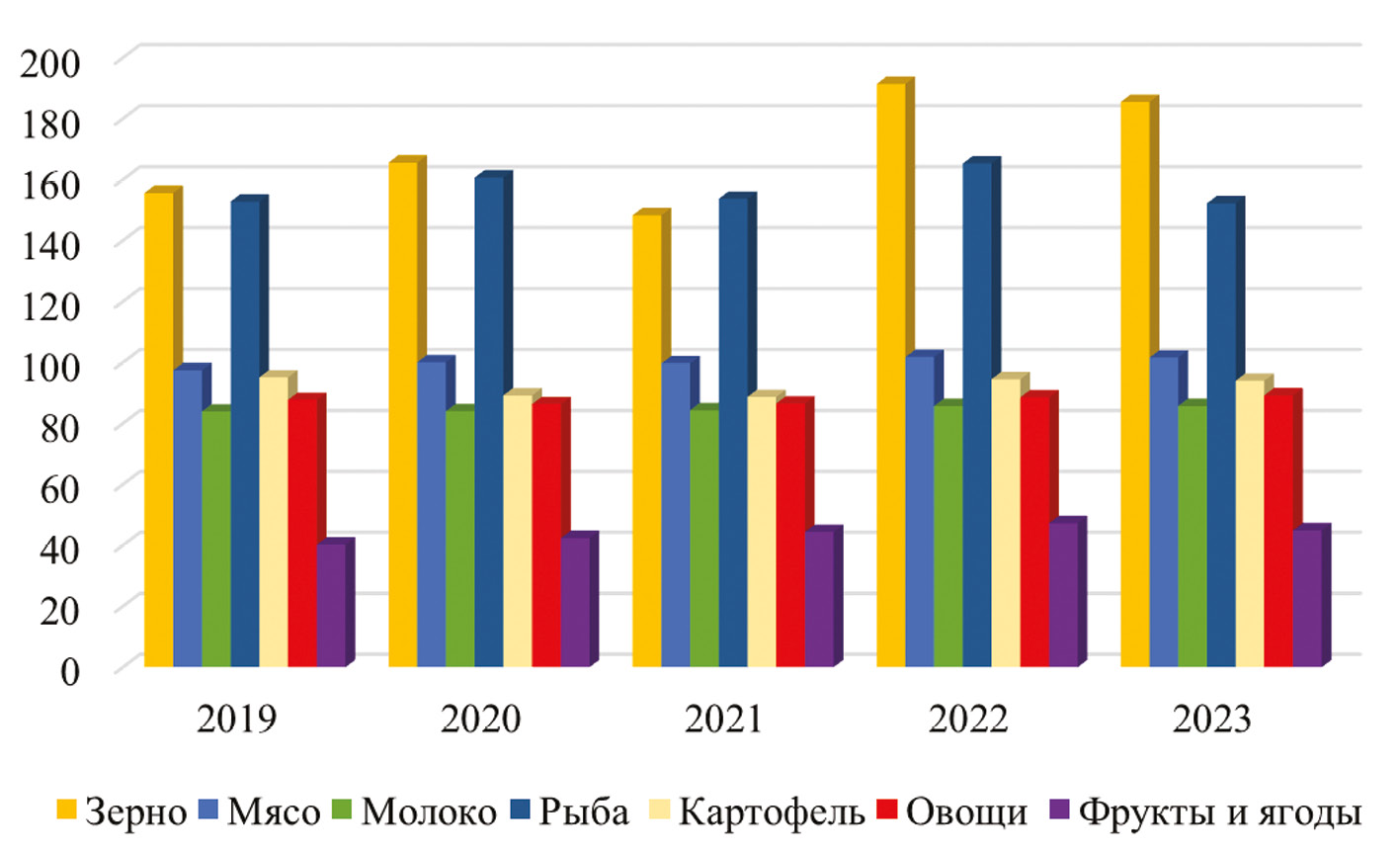 Результаты. Продовольственная безопасность является одним из ключевых приоритетов развития России, особенно в условиях внешних санкций [2]. Достижение этой цели невозможно без самообеспечения основными продуктами питания (рис. 1).