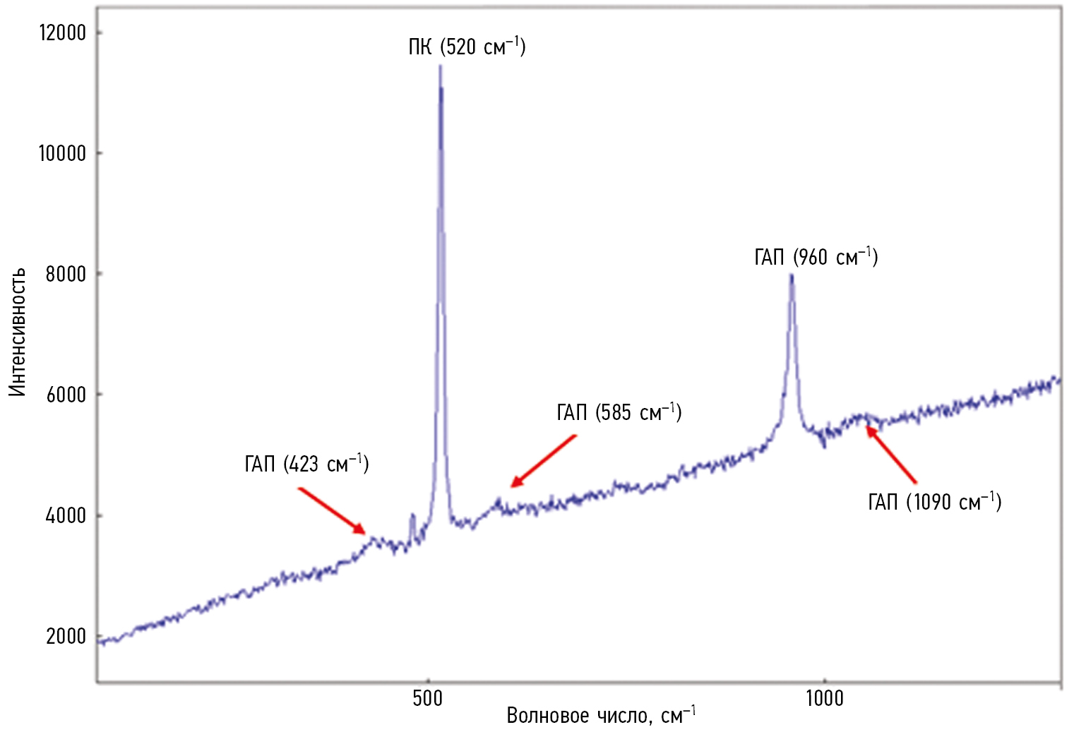 Результаты. Экспериментальные исследования позволили установить, что параметры формирования пористого слоя: плотность тока 10 мА/см², время травления 10 мин — обеспечивают пористость 22±3 %. Режимы лазерной обработки существенно влияют на морфологию частиц: скорость сканирования 300–500 мм/с обеспечивает преобладание частиц размером 0,5–2 мкм. Частота импульсов 20–50 кГц предотвращает образование крупных агломератов. Мощность 8–12 Вт оптимальна для сохранения структурной целостности компонентов. В результате лазерной абляции частицы порошка нанокомпозита ПК+ГАП оплавляются и принимают округлую форму. Спектроскопические исследования подтвердили сохранение кристаллической структуры гидроксиапатита после всех стадий обработки (рис. 1):