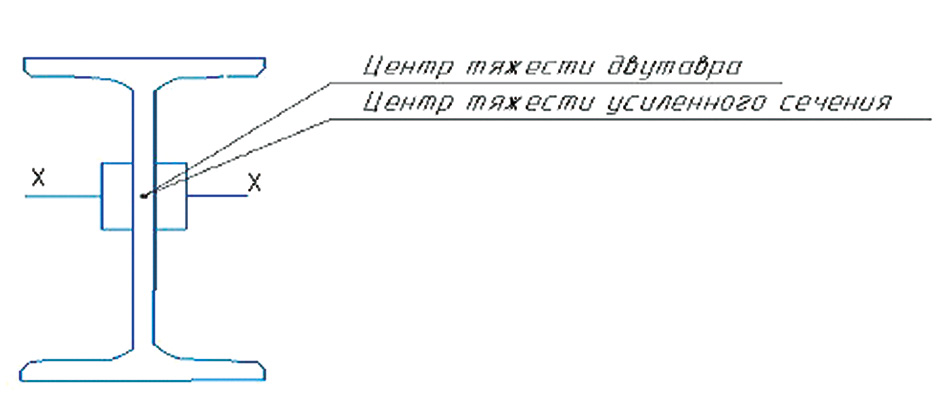 При расчетах были определены геометрические характеристики двутавра, усиленного полосой: поперечное сечение изменяется, следовательно, меняется геометрия сечения, так находя новое положение центра тяжести: