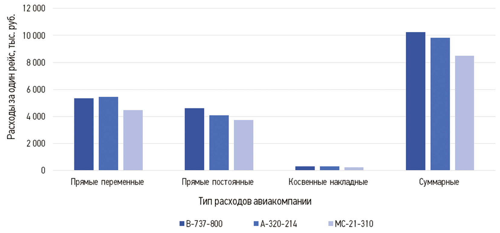 При анализе долей расходов было определено, что свыше 50 % всех затрат на выполнение рейса отводится на расходы, связанные с авиационными горюче-смазочными материалами и выплатами на лизинг или амортизацию воздушных судов. Наименьшая величина авиационной составляющей затрат на выполнение рейса наблюдается у МС-21-310. Однако на настоящий момент по данному современному типу самолета не завершены сертификационные испытания, отсутствует серийное производство, а также отсутствует квалифицированный авиационный персонал, что свидетельствует о некоторой доли условности в проведенных расчетах.