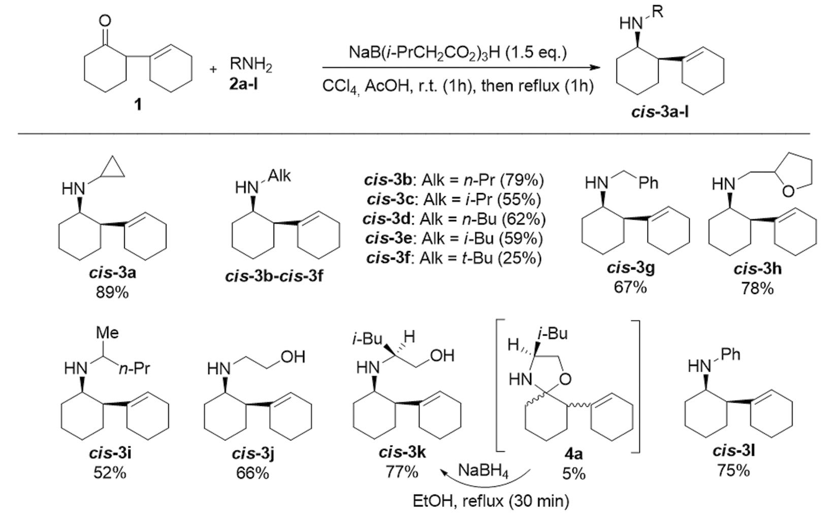 Рис. 1. Схема цис-диастереоселективного синтеза вторичных аминов на основе кетона 1